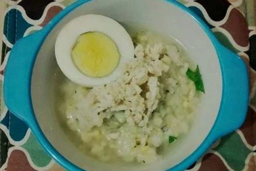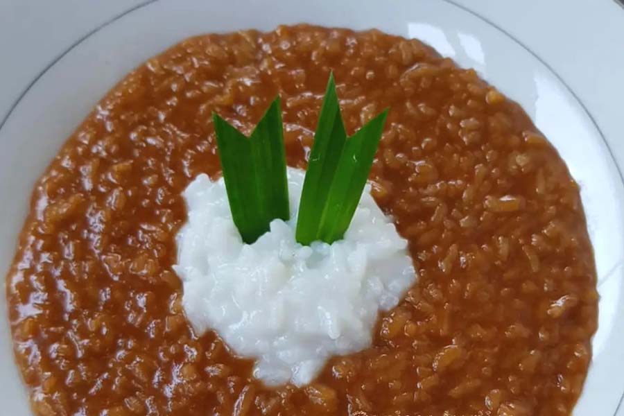 Bubur nasi dengan santan dan sedikit gula merah, minuman susu atau air putih