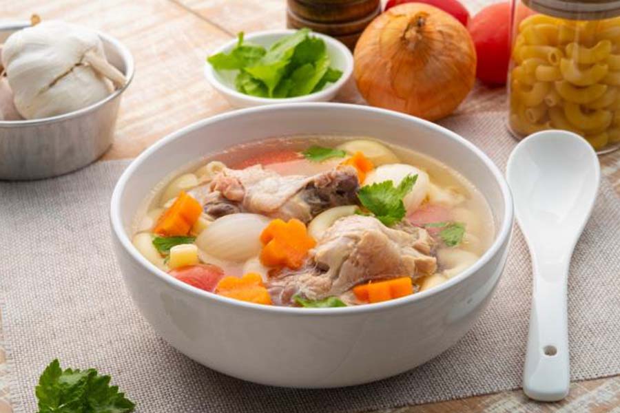 Sup sayuran (wortel, kentang, daun bawang) dengan potongan ayam dengan susu hangat