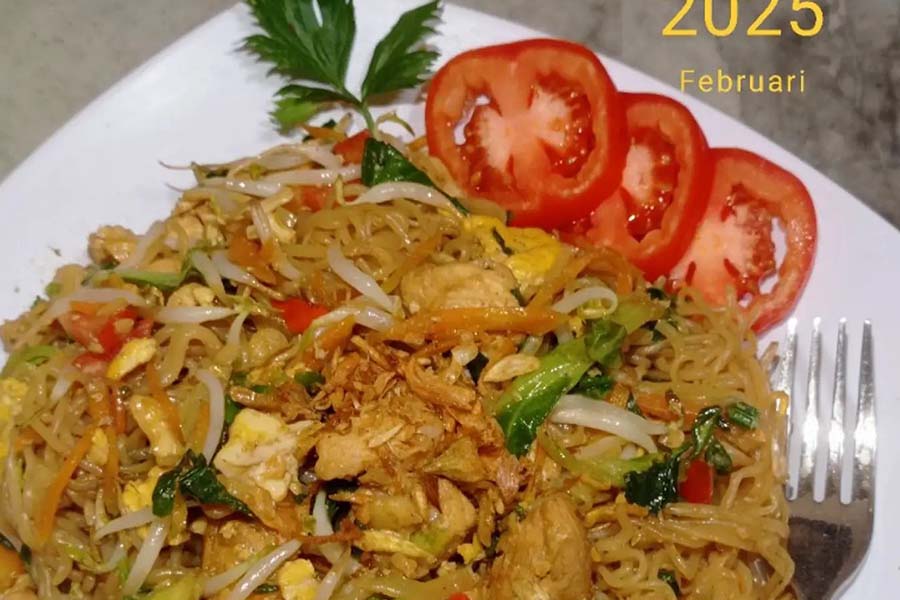 Nasi dengan tumis tempe, tahu, dan sayuran (wortel, buncis) dengan air mineralKarbohidrat (nasi), protein (tempe, tahu), vitamin dan mineral (sayuran).