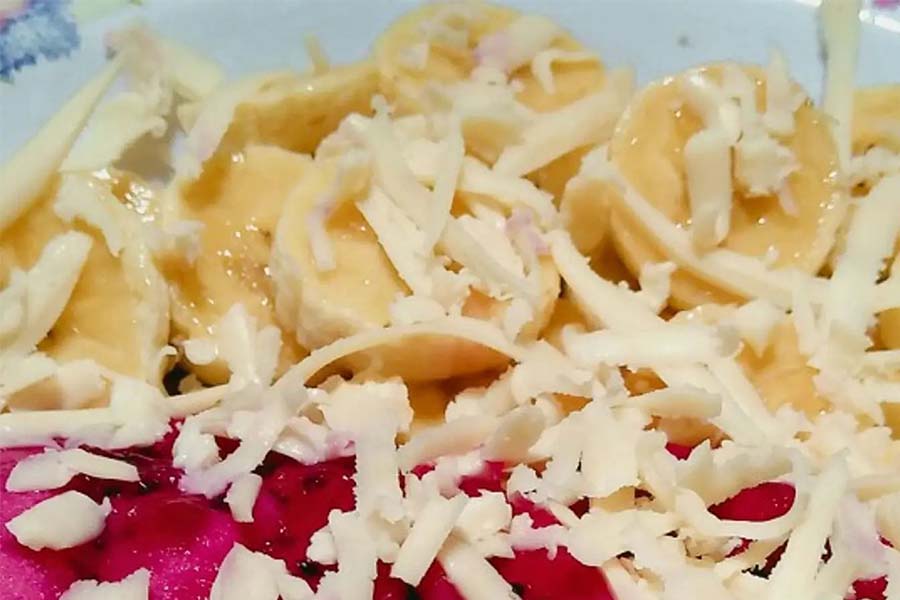 Buah potong (pisang atau apel) dengan keju parut.Serat dan vitamin (buah), protein dan kalsium (keju).