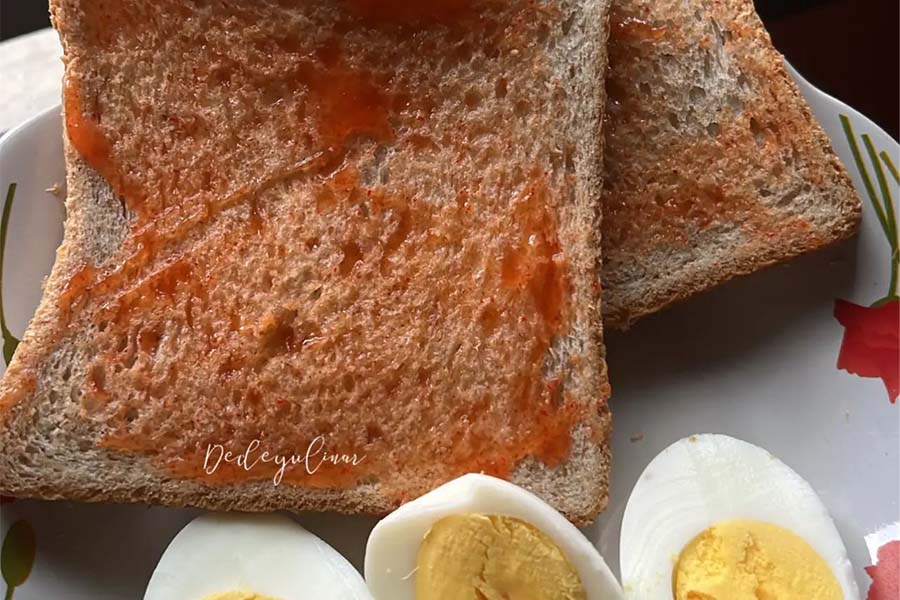 Telur rebus dengan roti gandum bakar dan sedikit margarin. Minum jus jeruk atau air putihProtein (telur), karbohidrat (roti gandum), lemak sehat (margarin).