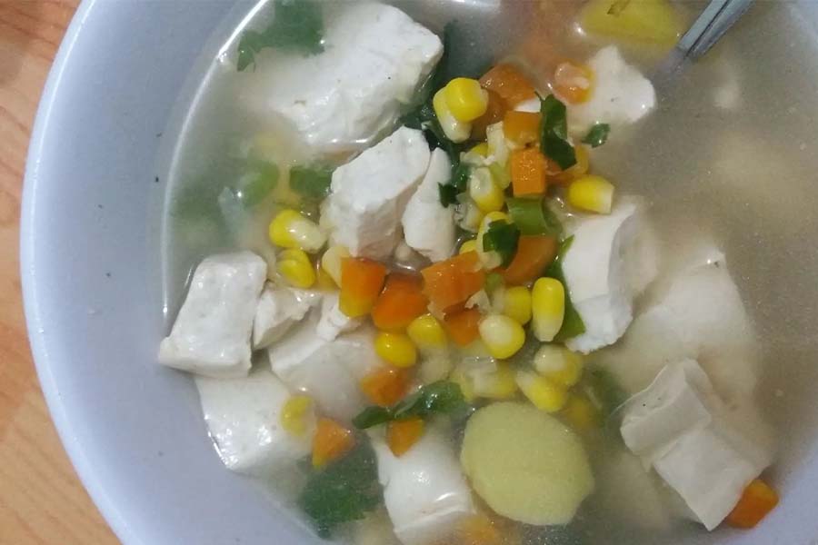 Sup jagung dengan tahu dan sayuran. dengan minum susu hangatKarbohidrat (jagung), protein (tahu), vitamin dan mineral (sayuran).